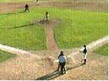 Una avioneta aterriza en un campo de baseball mientras se juega un partido. |
