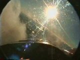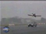 aterrizando sobre la plataforma de un remolque en marcha. |
